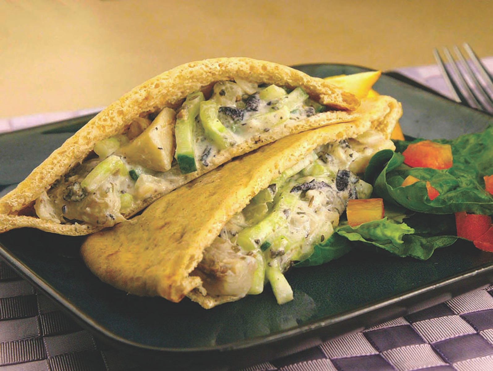 Herring in sour cream is mixed with diced onion, cucumber, olive and Greek seasonings then placed in a pita bread with shredded lettuce and tomatoes.